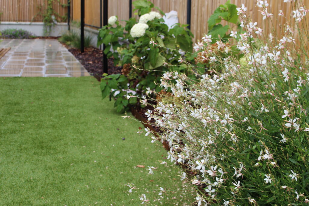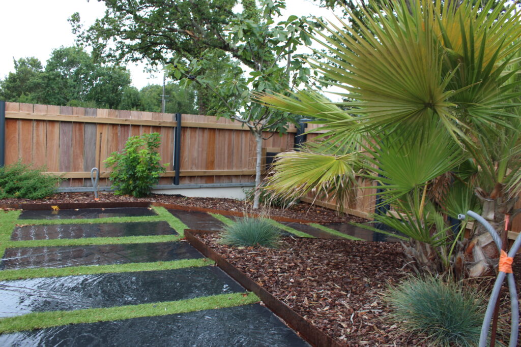 Les bordures et le bac en acier corten, aux lignes sobres et contemporaines, structurent les massifs et soulignent l’esthétique paysagère avec une touche minérale et chaleureuse. Elles s’accordent parfaitement aux pas japonais en ardoise et aux zones de gazon, offrant un équilibre subtil entre rigueur géométrique et liberté végétale.