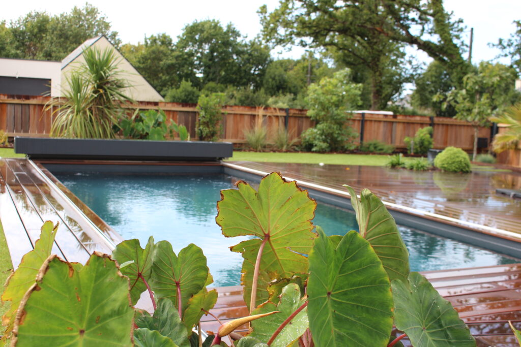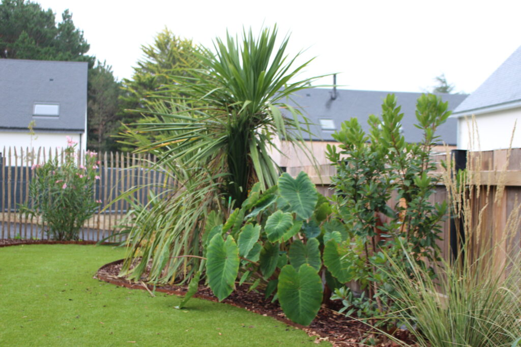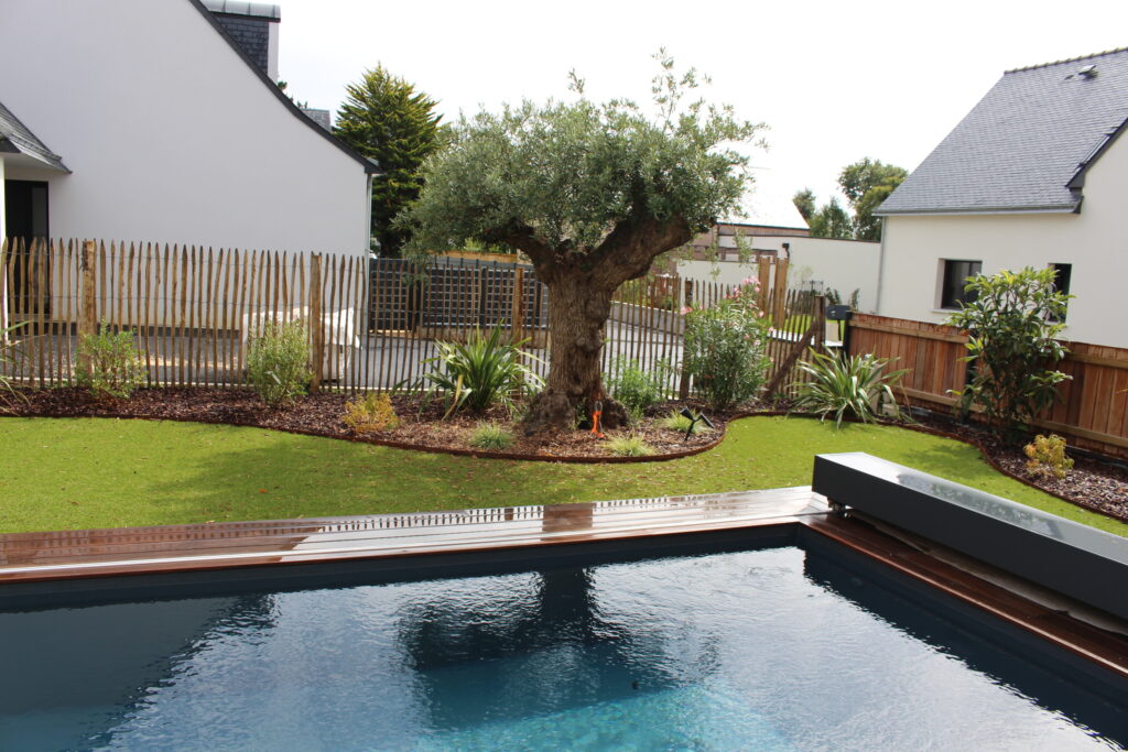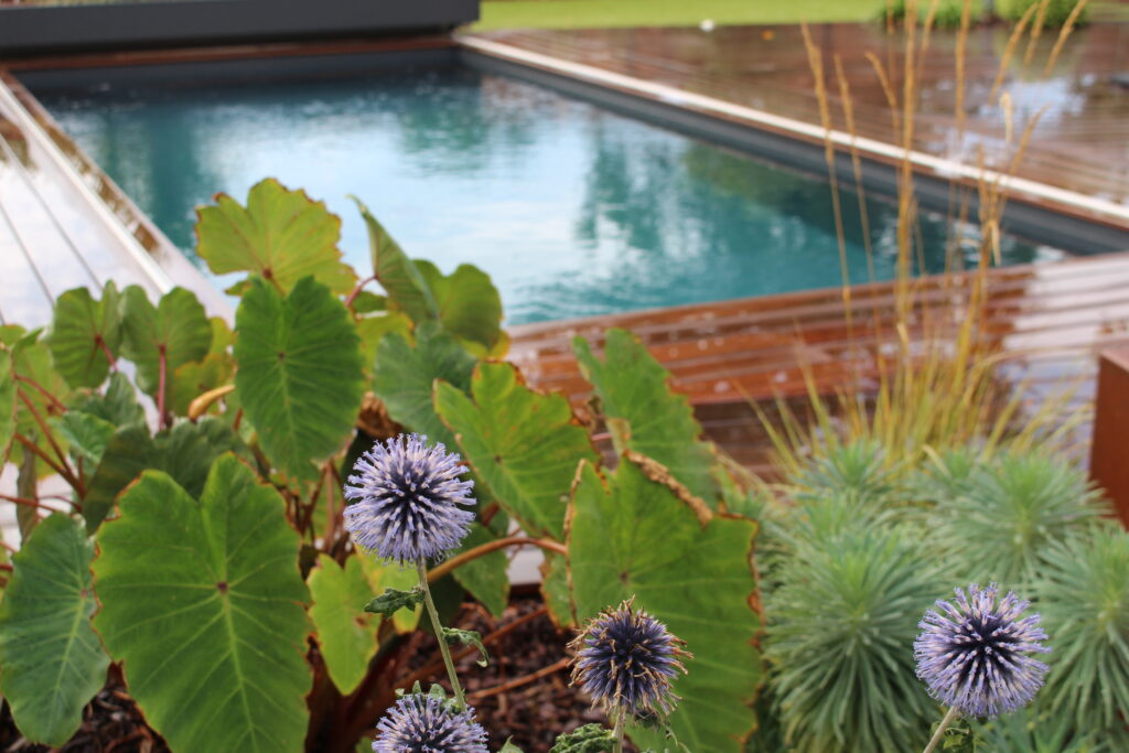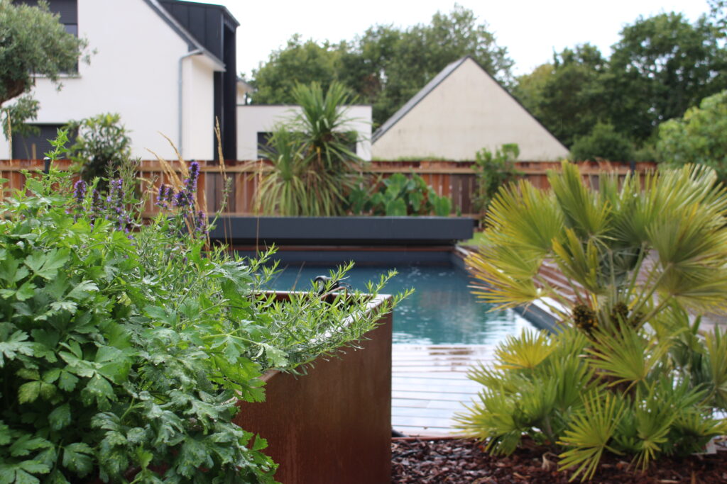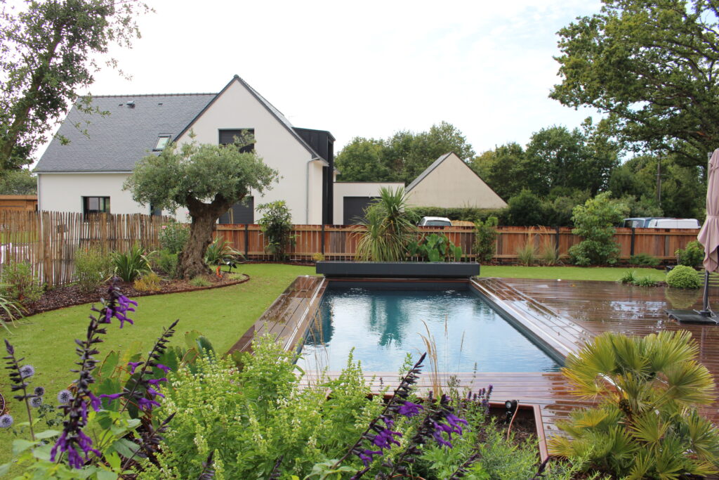 Autour du bassin, les plantations jouent la carte du contraste et de la diversité : palmiers exotiques, grand olivier et massifs généreux se mêlent pour composer un décor à la fois méditerranéen et graphique. Les vivaces fleuries aux teintes violacées viennent ponctuer les perspectives et attirer le regard, tandis que des graminées légères apportent mouvement et douceur au fil du vent.