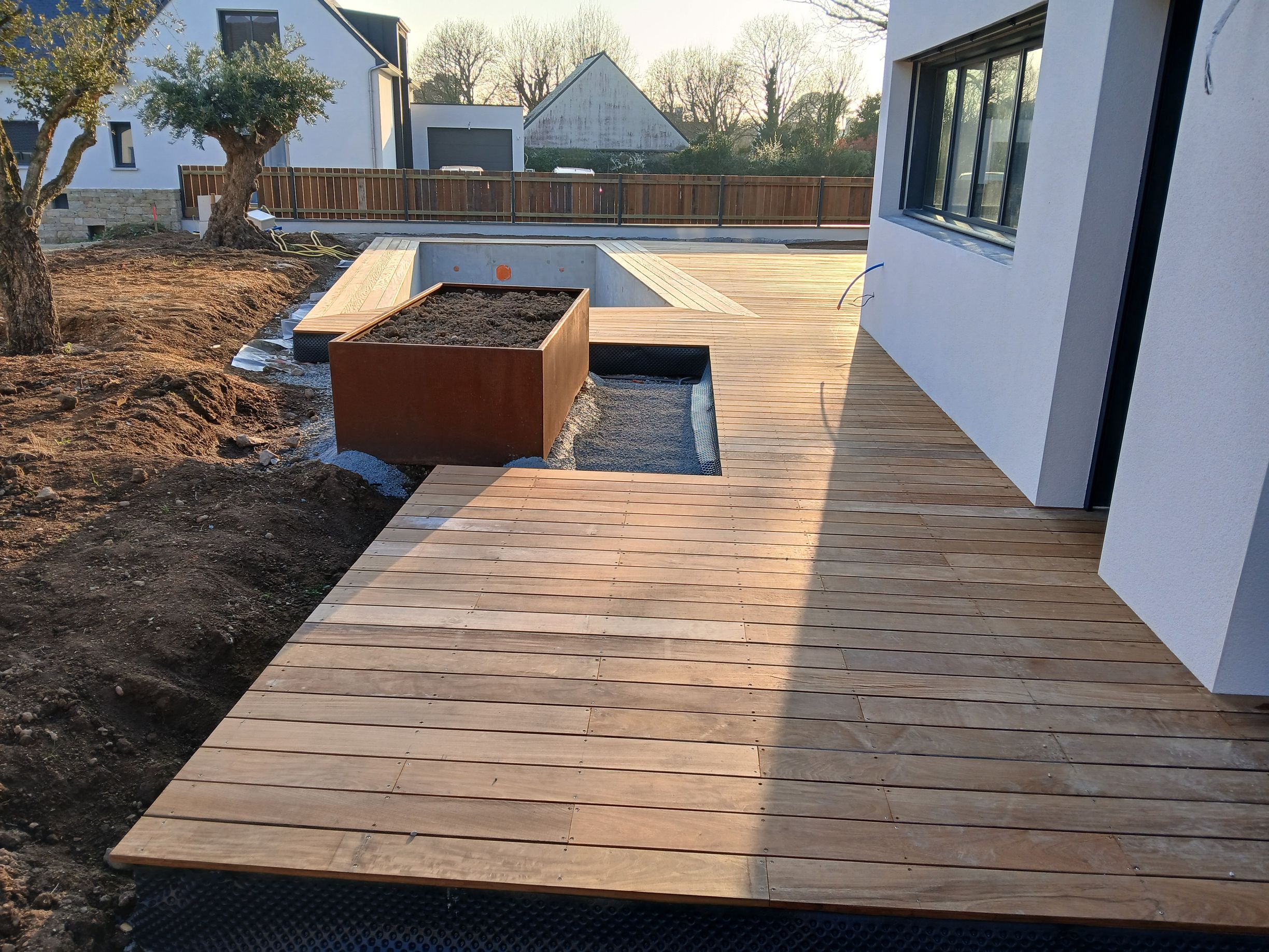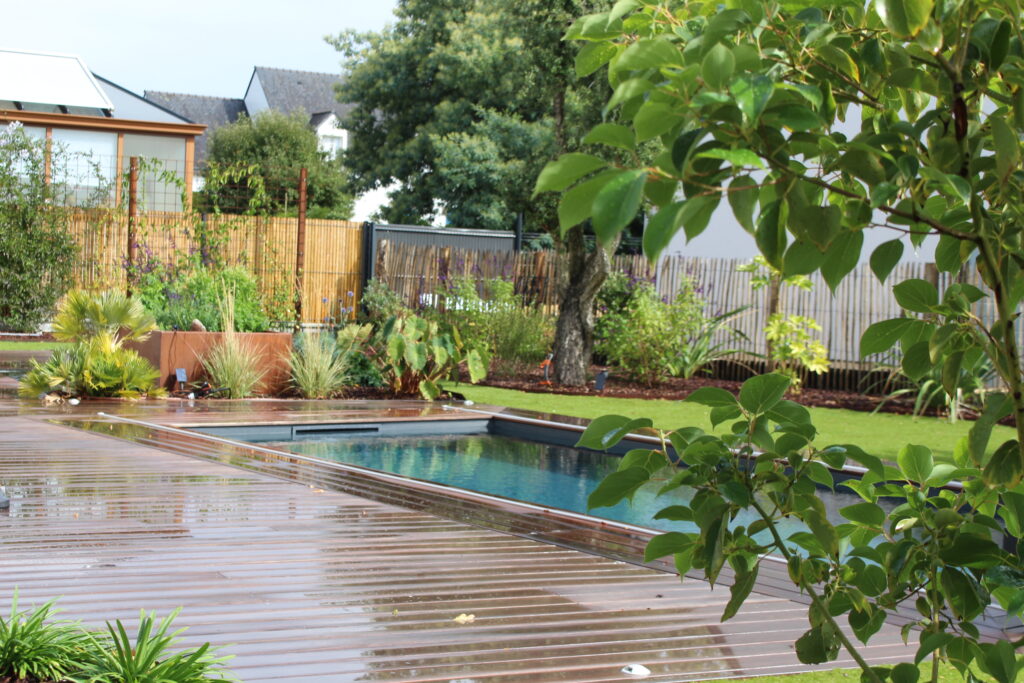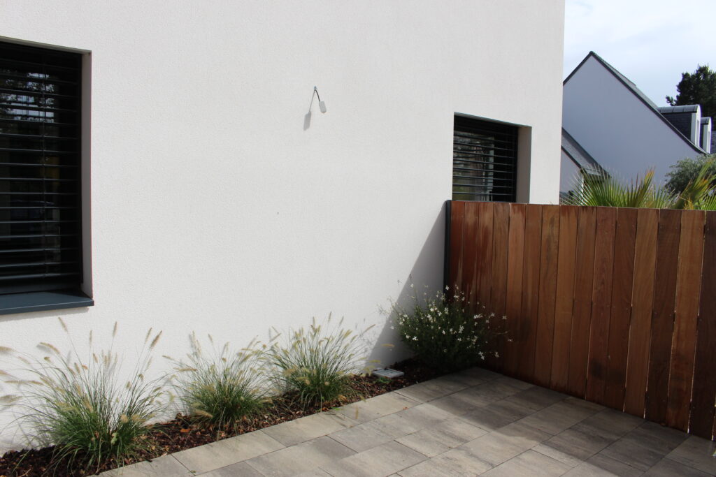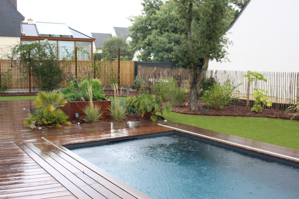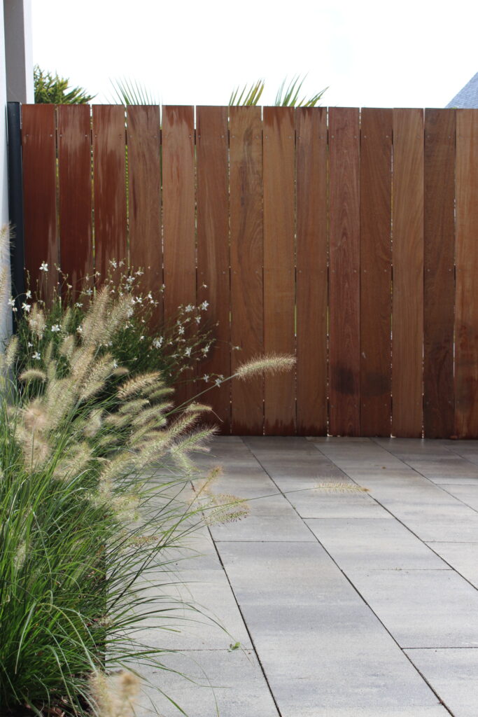 Une belle clôture en bois exotique en adéquation avec la terrasse dissimule ce jardin du reste du lotissement.