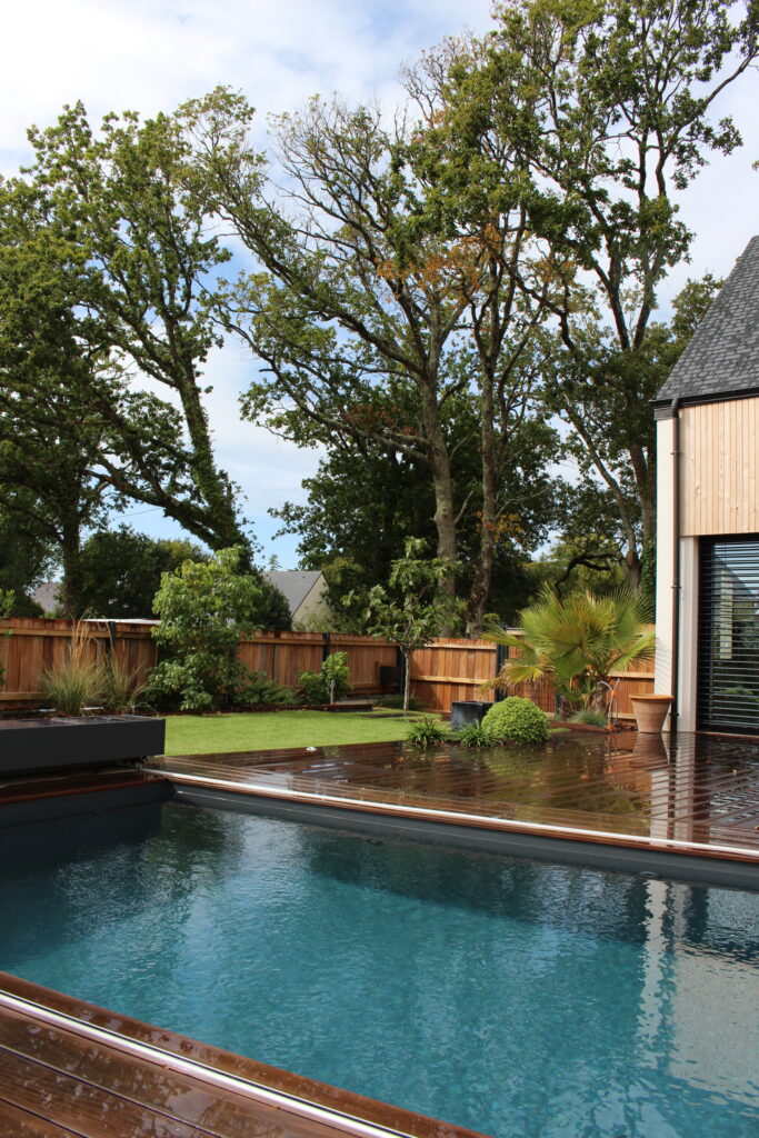 Au cœur de l’espace, une piscine rectangulaire s’étire, bordée d’une élégante terrasse en bois qui capte la lumière et crée une atmosphère conviviale.