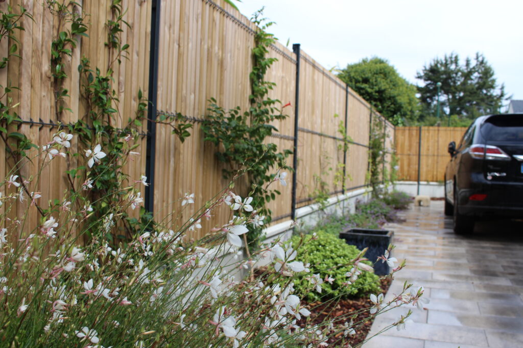 L’aire des stationnement pavée est ceinturée de plantes volubiles qui courent sur les lamelles de la clôture et les vivaces graciles donnent du mouvement à l’ensemble.